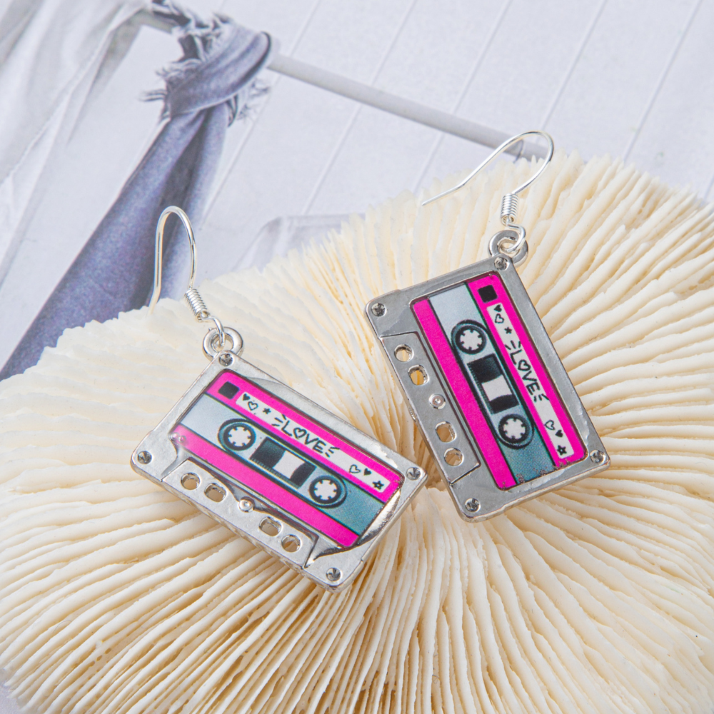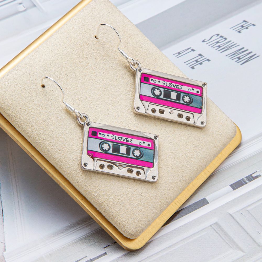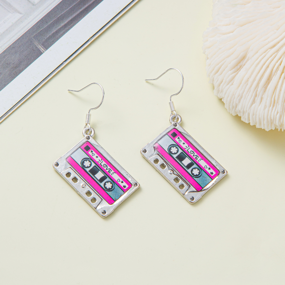 A: The Cassette Tape Earrings are made from high quality silver plated alloy and durable copper ear hooks.