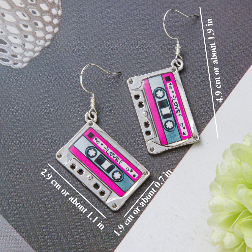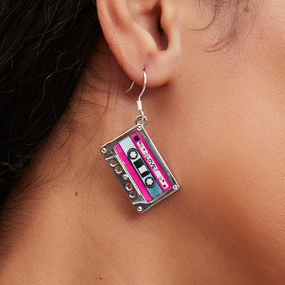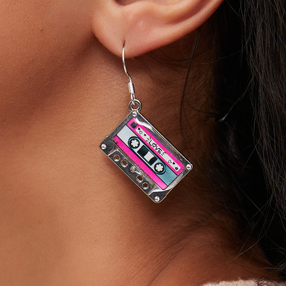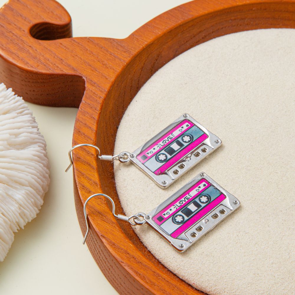 A: The Cassette Tape Earrings are made from high quality silver plated alloy and durable copper ear hooks.